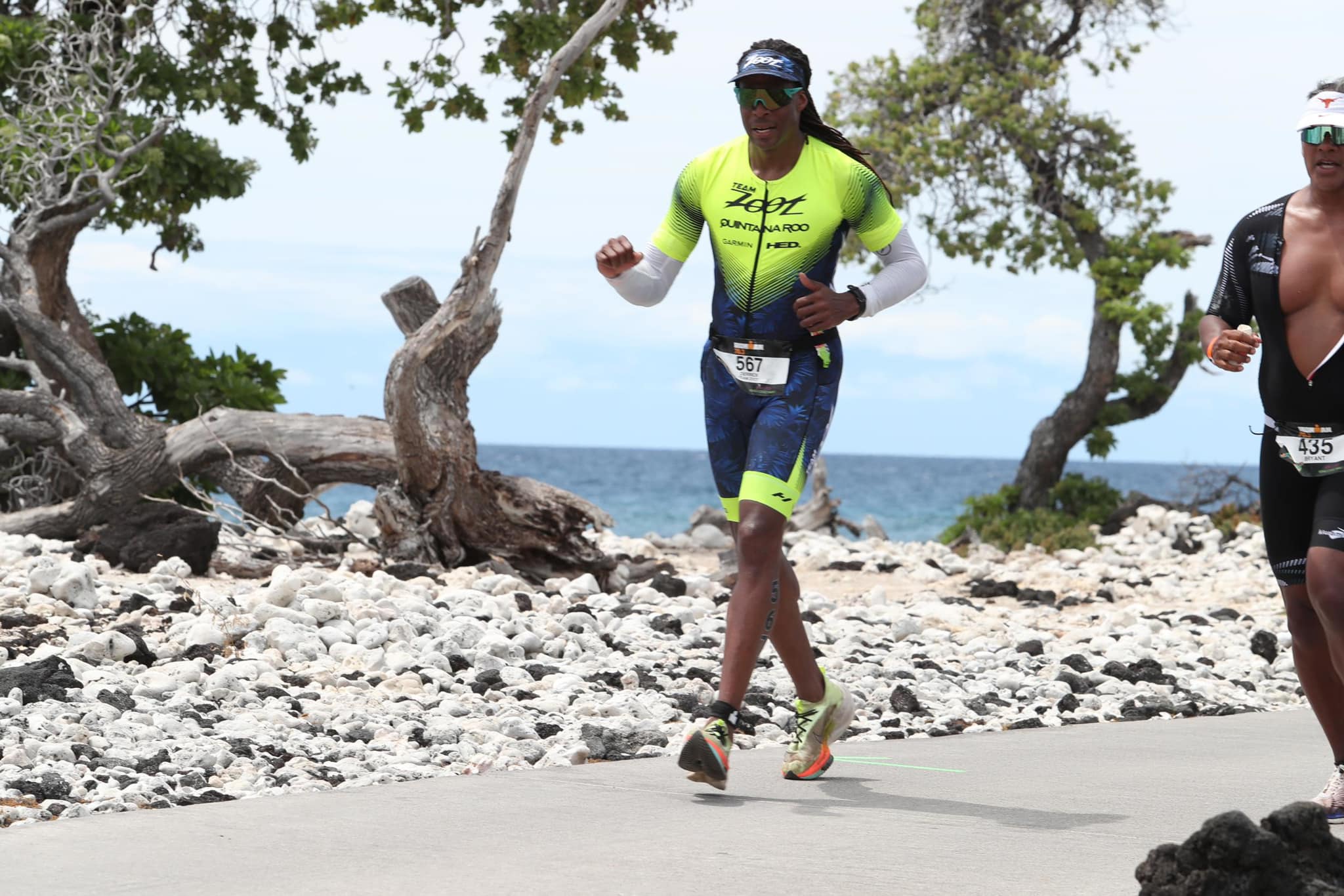 I loosened my shoes while biking, preparing for a fast transition. After a quick left turn, the transition line was on me faster than I expected. I only had time to remove one foot out of my shoe!! I just had to laugh at myself. After dismounting, I hand carried my other shoe, racked my bike, then grabbed my run bag to prepare for the last leg. I tried again to remove what felt like a pebble embedded in my toe. I felt loose skin. I had cut myself on the coral getting out of the swim. Oh oh, bad sign to begin the run.Time: 4:17